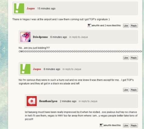 FOR ALL YOU PEOPLE THAT WANT TO KNOW WHERE THEY ARE THEY ARE IN VEGAS!!! I was at the airport picking up my friends coming from the Korean Air flight that arrived at 4 and they all came out and were in a hurry. No one knew who they were and it was so unexpected. I got TOP’s signature!!!
