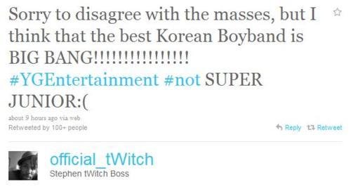 Choreographer tWitch exclaimed his opinion in twitter on who is the best Kpop boyband. He said on his tweet that it’s Big Bang and he added a hashtag #not Super Junior. This is what his whole tweet says,