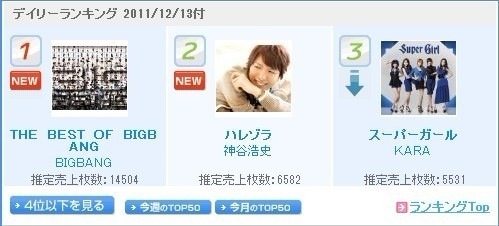 Articles, NEWS [NEWS][11.12.13] BIGBANG’s Ranking on the Daily Oricon Charts December 17, 2011 yongsvvip Leave a comment Their Best of Album is currently #1: Their “Love and Hope Tour 2011” DVD is in 3rd: *Note: So far this is for 11/12/13 only. Source: @mystifize and bigbangforlife@tumblr.com; bigbangupdates.com Share this: Click to share on X (Opens in new window) X Click to share on Facebook (Opens in new window) Facebook Click to share on Tumblr (Opens in new window) Tumblr Click to share on Pinterest (Opens in new window) Pinterest Like Loading... Related