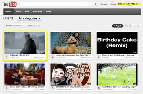 NEWS, Official, Photos, ScreenCaps, Videos [NEWS] Big Bang’s “Blue” hits 3 million views one day after its release, #1 on Youtube daily charts February 23, 2012 †HE BADDES† Leave a comment MOST DISCUSSED MOST VIEWED TOP FAVORITED Share this: Click to share on X (Opens in new window) X Click to share on Facebook (Opens in new window) Facebook Click to share on Tumblr (Opens in new window) Tumblr Click to share on Pinterest (Opens in new window) Pinterest Like Loading... Related