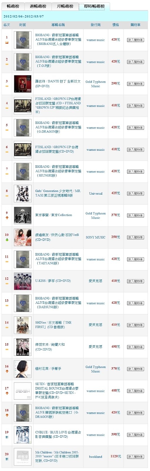 According to Taiwan’s online music sales site books.com, Big Bang’s mini album ‘ALIVE‘ is #1 on the Asia album sales chart.