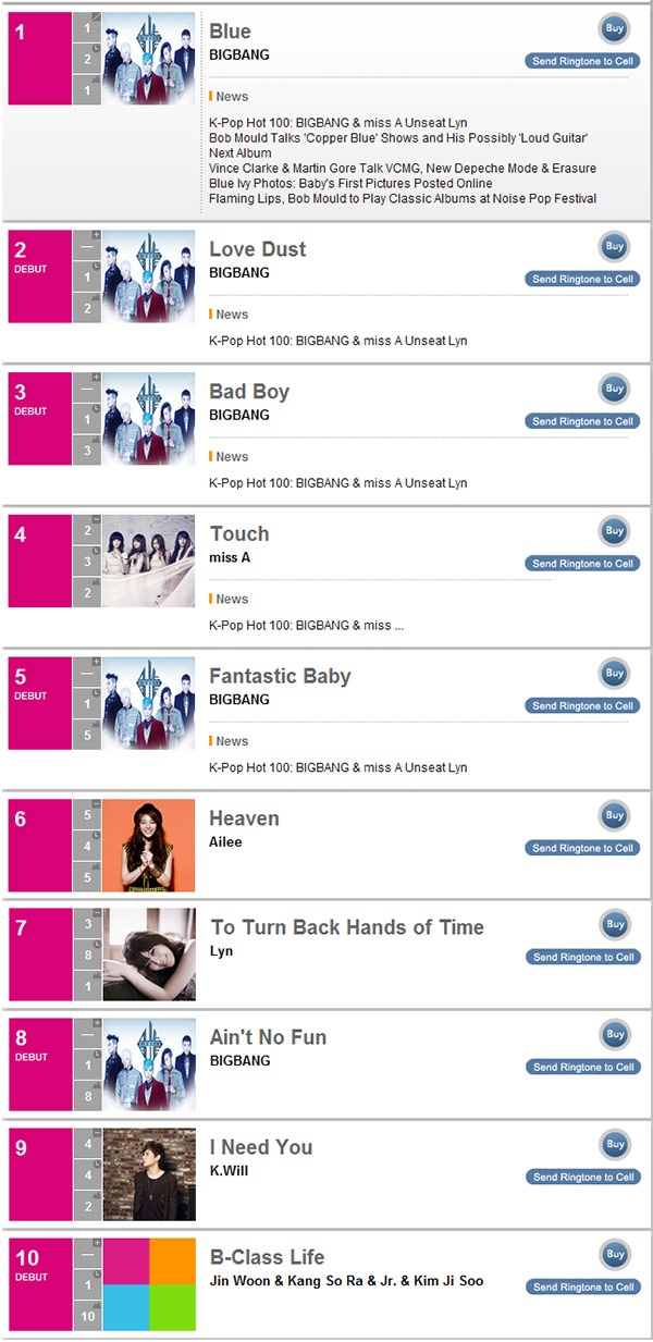 Of the top 10, Big Bang took a whopping 5 spots! “Blue” came in at #1 followed by “Love Dust” at #2, “Bad Boy” at #3, “Fantastic Baby” at #5, and “Ain’t No Fun” at #8. Other notables on the list include miss A‘s “Touch” at #4, Ailee with “Heaven” at #6, Lyn‘s “To Turn Back Hands of Time” at #7, and K.Will‘s “I Need You” at #9.