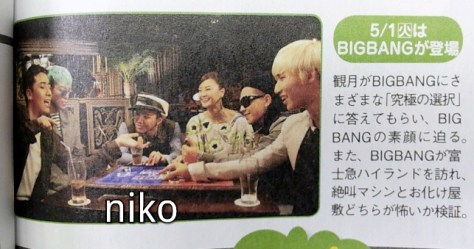 Catherine is a new Japanese variety show on Fuji TV. The May 1st episode will feature BIGBANG’s interview with actress Alisa Mizuri (one of Catherine’s hosts) and their visit to Fuji-Q Highland Amusement Park.