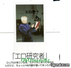 Translation: “pervert researcher. D-lite reading book that he found in the studio. which has adult contains.”