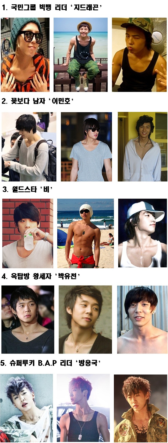 World star Rain, JYJ‘s Park Yoochun, Big Bang‘s G-Dragon, Lee Min Ho, and B.A.P‘s Bang Yong Guk have been battling it out on a recent online community portal site for the best, sexiest collarbone.