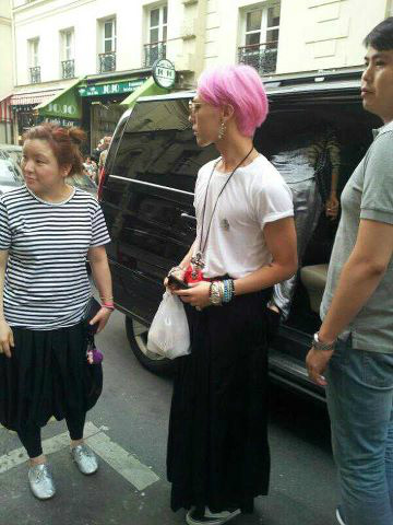 Translation: Round glasses, cross, rosy hair, bucket hat. Leader of Bigbang which is K-Pop star, G-Dragon is at Yohji Yamamoto’s show in Paris today.