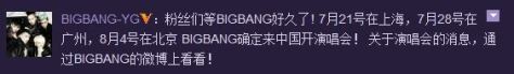 Trans: Fans have been waiting for a very long time! Big Bang is confirmed to have concerts in China. 21 July in Shanghai, 28July in Guangzhou, and 4 August in Beijing! More concert information is available at BIGBANG’s weibo.
