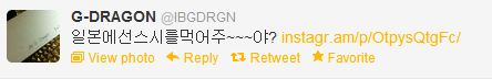 Instagram, Photos, Twitter [PHOTO][Twitter/Instagram] G-Dragon with Daesung and Taeyang 120824 August 24, 2012 jinhichole18 Leave a comment TRANS: You’ve got to have Sushi when you’re in~~~ Japan? Source: IBGDRGN Translation by big_seunghyun Share this: Click to share on X (Opens in new window) X Click to share on Facebook (Opens in new window) Facebook Click to share on Tumblr (Opens in new window) Tumblr Click to share on Pinterest (Opens in new window) Pinterest Like Loading... Related