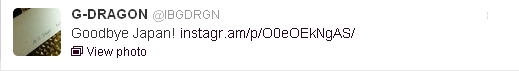 Instagram, Photos, Twitter, Twitter Update [PHOTO][Twitter/Instagram] G-Dragon: “Goodbye Japan!” 120827 August 27, 2012 jisparrow Leave a comment Source: G-Dragon’s Twitter Share this: Click to share on X (Opens in new window) X Click to share on Facebook (Opens in new window) Facebook Click to share on Tumblr (Opens in new window) Tumblr Click to share on Pinterest (Opens in new window) Pinterest Like Loading... Related