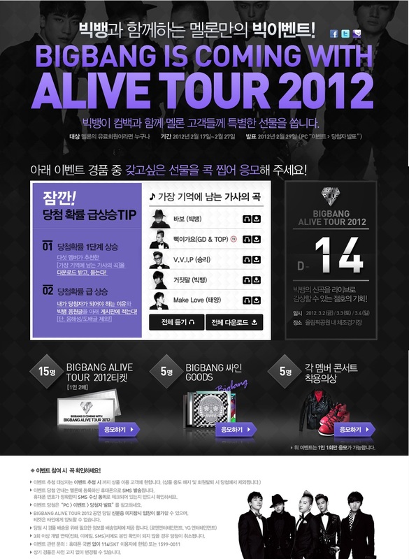 Note: It is a contest that talks about the prizes that someone can win (15 people winning concert tickets, 5 people winning signed albums, etc.) and shows Big Bang’s song picks for Melon.