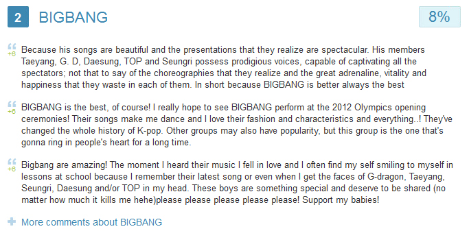 Super Junior was voted 1st, while K-Pop fans further voted Big Bang at #2 and SHINee at #6, showing the commitment of hallyu wave fans in promoting their favorite artists. Other Korean artist on the list include: Girls’ Generation at #11, 2NE1 at #32, KARA at #114, JYJ at #123, TVXQ at #136, Wonder Girls at #142, T-ARA at #154, B2st at #155, 4Minute at 191, f(x)at 192, Hang Geng at #195, B1A4 #215, A Pink #310,Kim Hyun Joong #331, 2PM at #332, and INFINITE at #345.