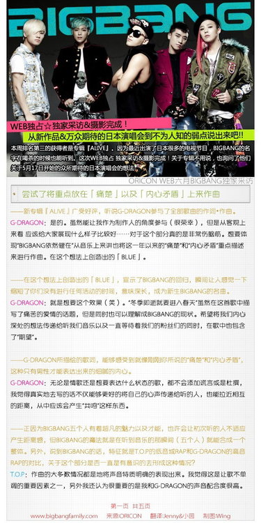 Q: Your new album ‘Alive’ has received good comments, it is said that G-Dragon has participated in melody and lyrics writing of all the songs? GD: Yes, I am so glad that I have participated in this album from the perspective of producer; however, objectively speaking,I want to show you our new sides…I was very troubled to think of it when it came to this part. I want to show you the message that ‘Big Bang is still alive; and convey you the ‘pains’ and ‘internal struggles’ that we have been going through this year so we have created ‘Blue’. Continue reading [INTERVIEW][Translation] Big Bang’s interview on Oricon June Issue→