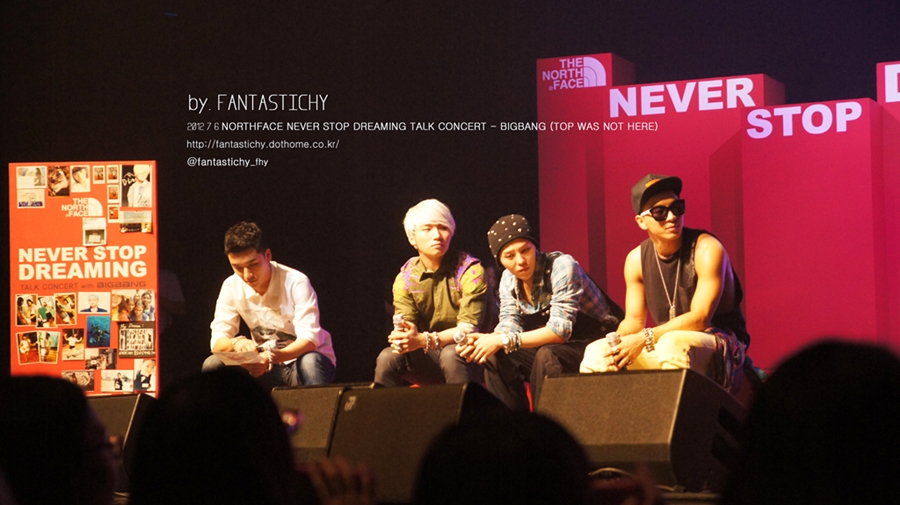 On July 6, during the βNorth Face: Never Stop Dreaming Talk Concert with Big Bangβ in Korea the group met with fans and performed some of their latest hits. Even though T.O.P was noticeably absent, due to his filming schedule for the motion picture βAlumni,β fans need not worry as G-Dragon filled in for the husky, voiced rapper. Though he was still greatly missed.
