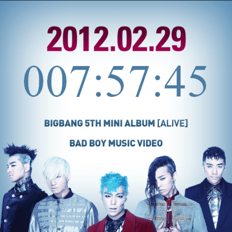 Info, Photos, ScreenCaps [INFO/PHOTO] YG Life Blog Update: BIG BANG 5th Mini Album Alive and Bad Boy MV Countdown! February 28, 2012 xandeelicious Leave a comment Thanks to @negimax for the screencap! Both BIG BANG’s 5th Mini Album Alive and Bad Boy MV will be released on 29th February 2012 at 12 AM KST! And that’s tonight! View the countdown here ^^ Share this: Click to share on X (Opens in new window) X Click to share on Facebook (Opens in new window) Facebook Click to share on Tumblr (Opens in new window) Tumblr Click to share on Pinterest (Opens in new window) Pinterest Like Loading...